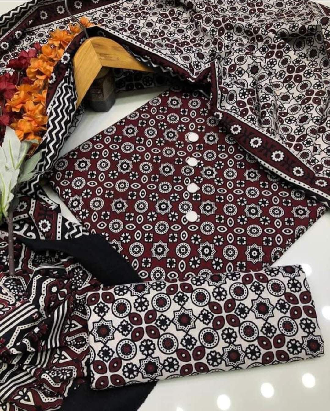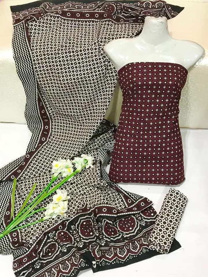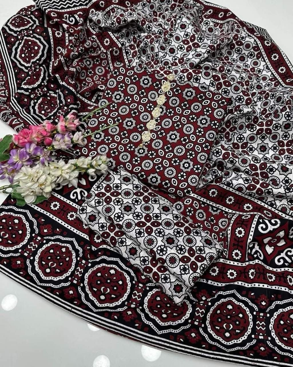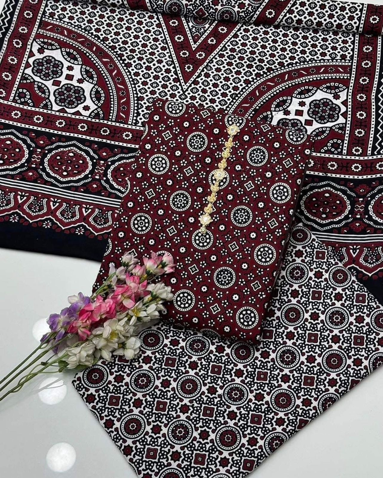 This three-piece unstitched suit comes with a beautifully designed Ajrak dupatta, shirt, and trouser. Its soft texture and breathable fabric ensure all-day comfort while keeping you cozy in winter. Pair it with ethnic jewelry or traditional khussas to complete your elegant look.