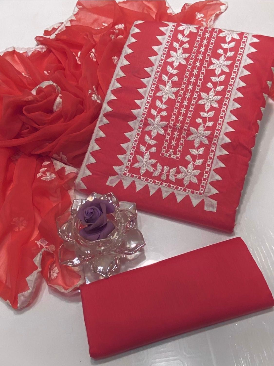 Applic Handmade With Machine Flower Embroidery Gala Bail Daman Work Soft Cotton Shirt & Trouser Along With Applic Handmade with Machine Embroidered Chiffon Dupatta 3pc Dress 👗