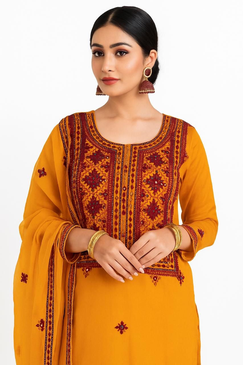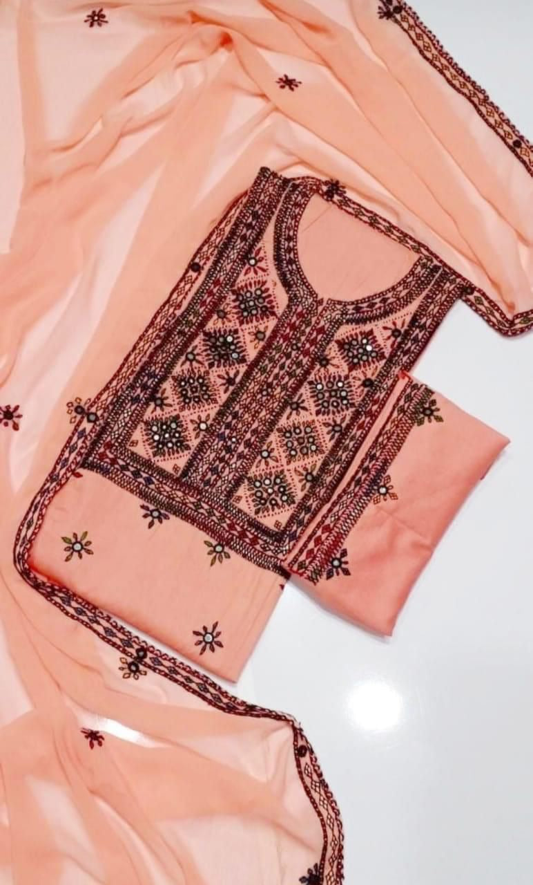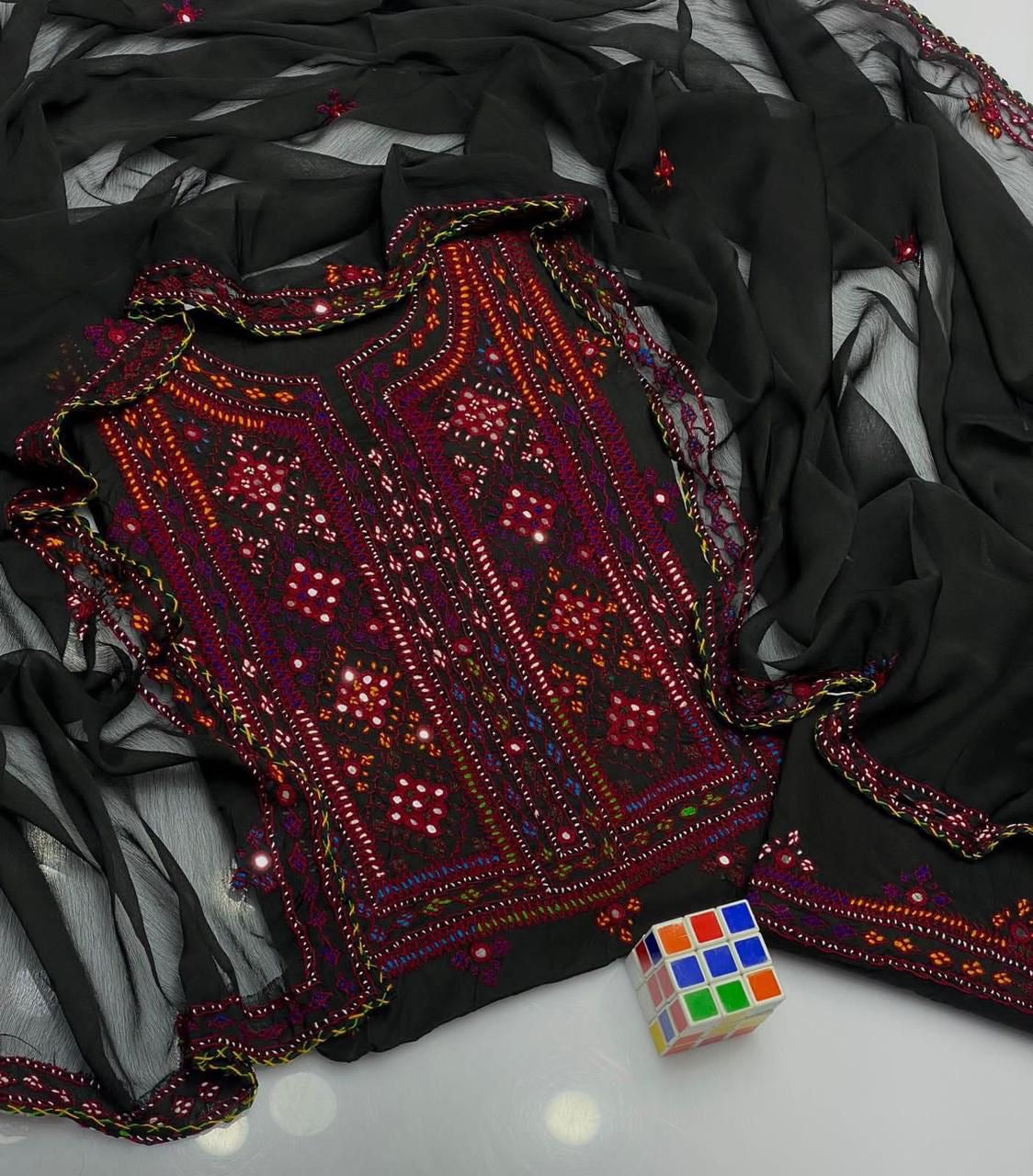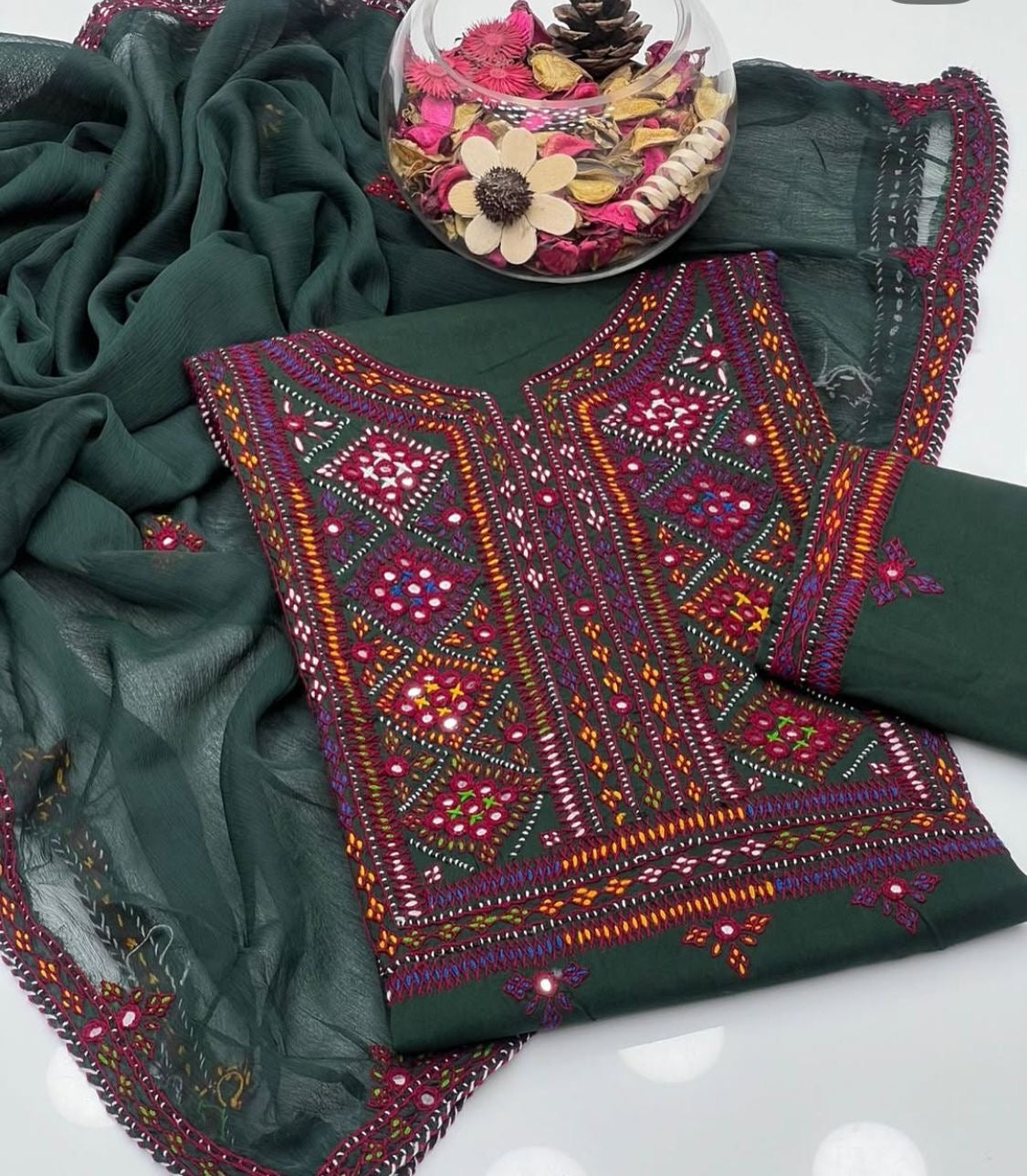 Discover the timeless beauty of traditional craftsmanship with this Balochi Handcrafted 3-Piece Dress, made from premium soft cotton fabric for both the shirt and trouser, paired with a lightweight soft chiffon dupatta.
