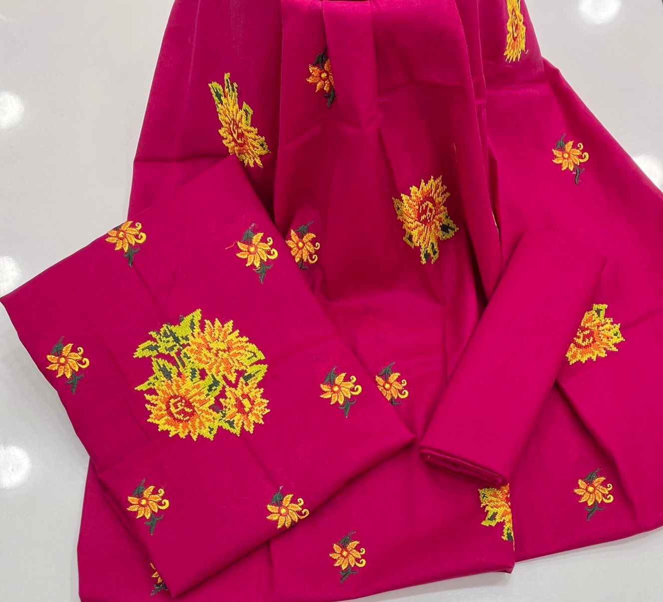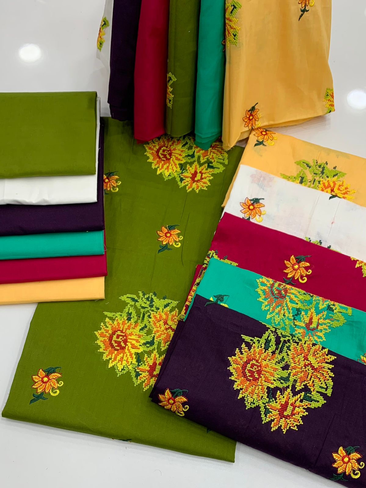 Soft Cotton Stuff Cross Stitch Sun Flower 🌻 Embroidered Shirt, Soft Cotton Sun Flower 🌻 Bunches Cross Stitch Embroiderd Dupatta, Plain Soft Cotton Trouser 3pc Dress 👗