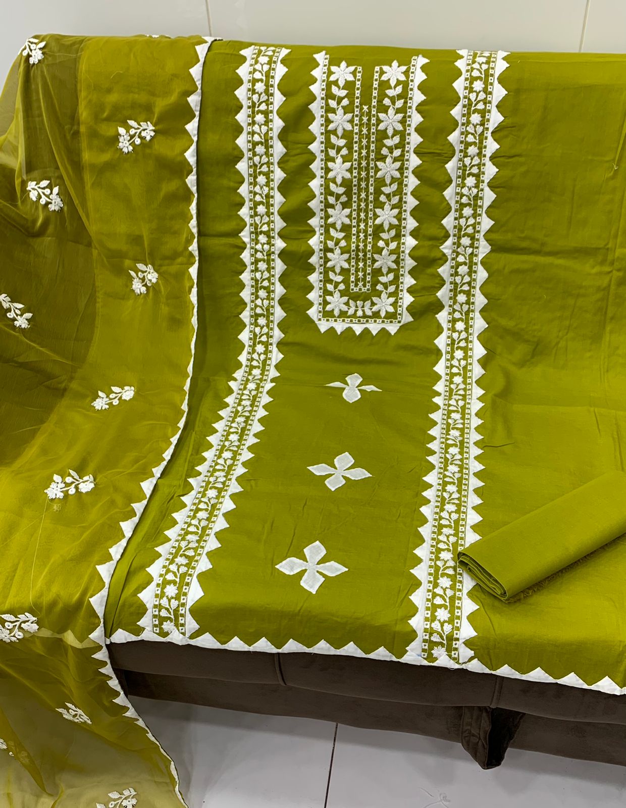 Elegant Applic+Thick Thread Work 3-Piece Cotton Suit