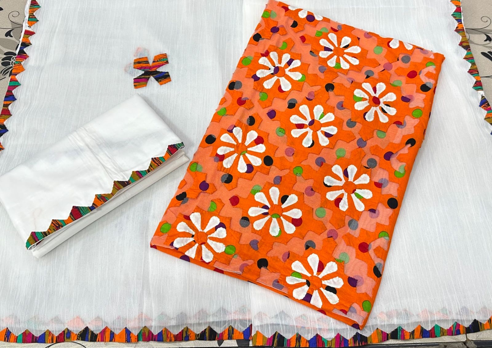 Flower Applic Handmade Chunri Print Soft Cotton Stuff Net Front Panel Shirt Chiffon Multi Applic Work Dupatta, Soft Cotton Trouser 3pc Dress π