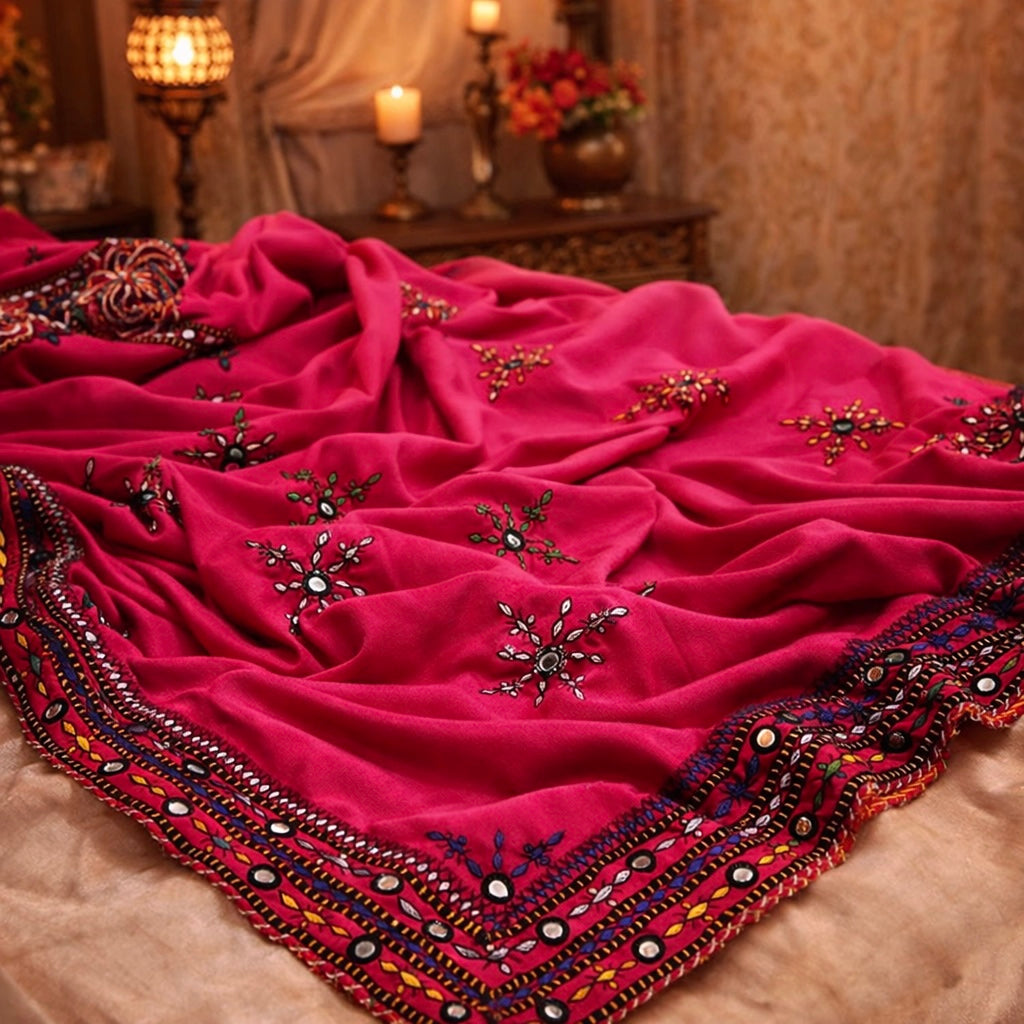 This premium Handmade Balochi Chadar showcases the beauty of traditional Balochi craftsmanship. Made from high-quality Swiss voile fabric, it is lightweight, soft, and breathable, ensuring comfort in all seasons.