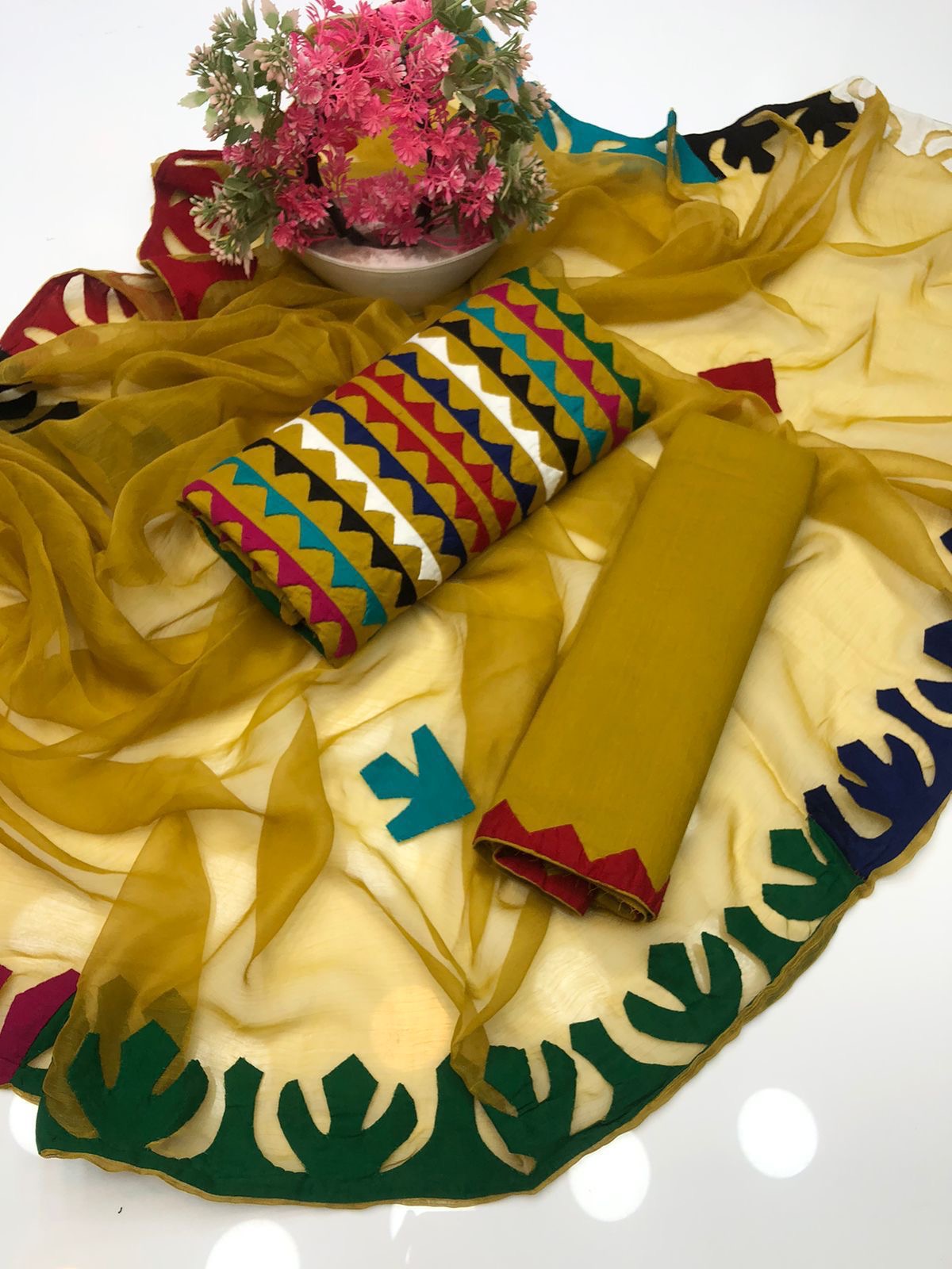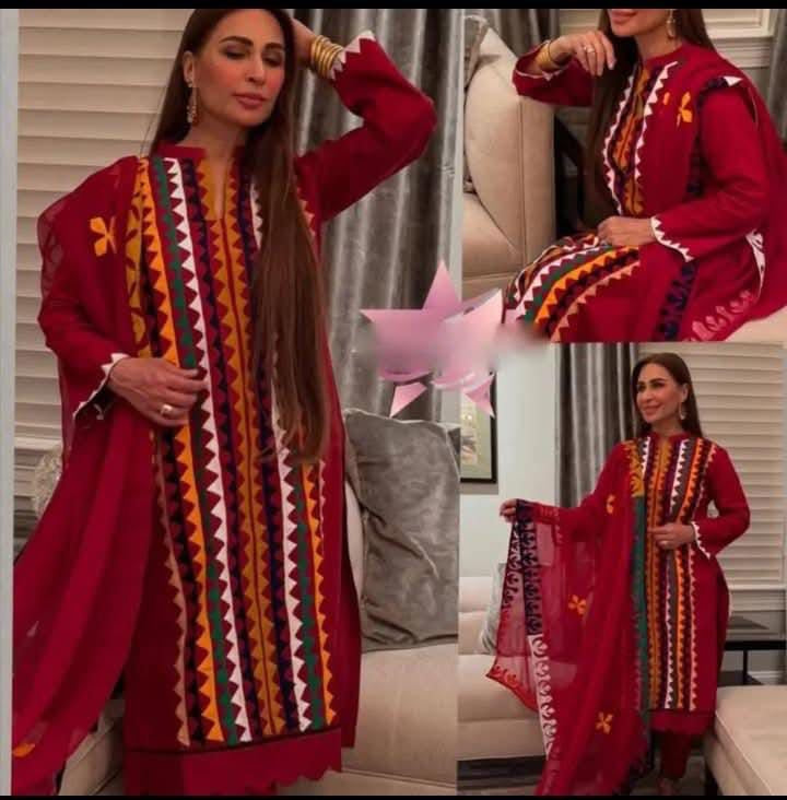 This stunning 3-piece handcrafted dress is a perfect blend of tradition and elegance. The soft cotton shirt and trouser feature exquisite handmade multicolor applique work that adds vibrant charm to your look. The chiffon dupatta is beautifully bordered on all four sides with delicate applique embroidery, making it an eye-catching statement piece. The trouser border also carries matching applique detailing for a complete coordinated finish.