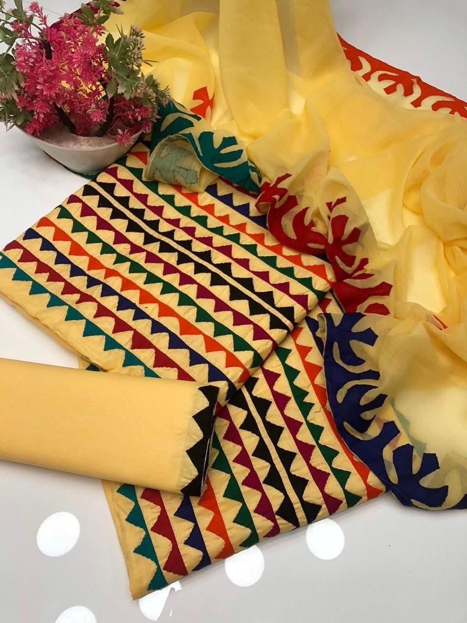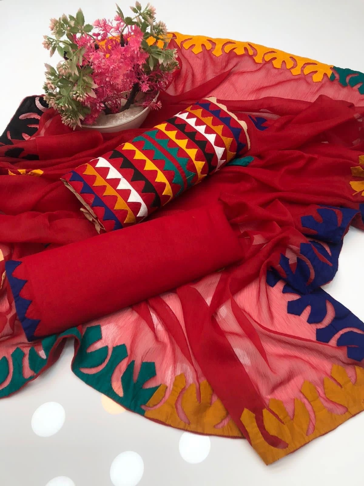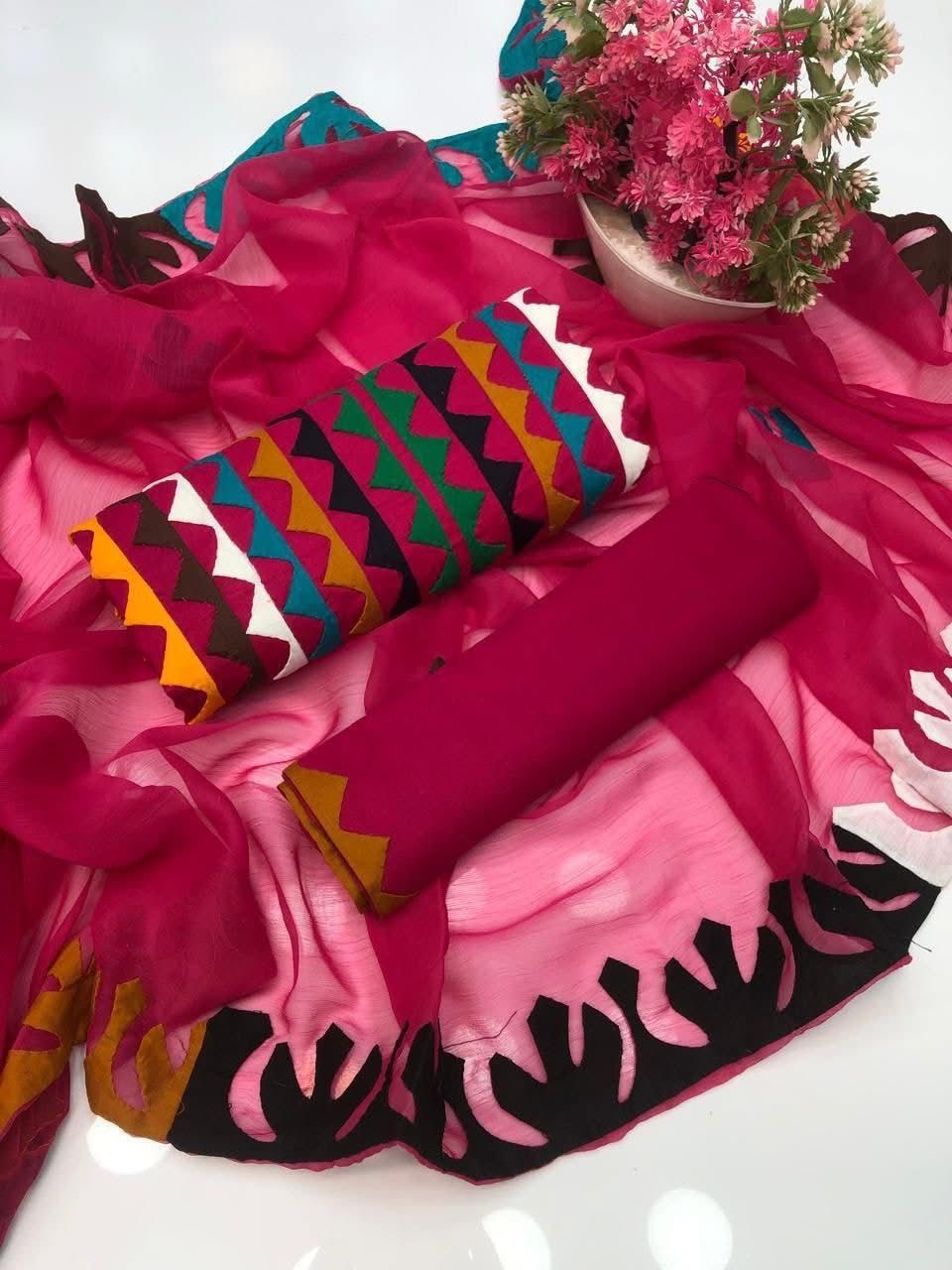 Multicolor Applique 3-Piece Dress – Soft Cotton with Chiffon Dupatta