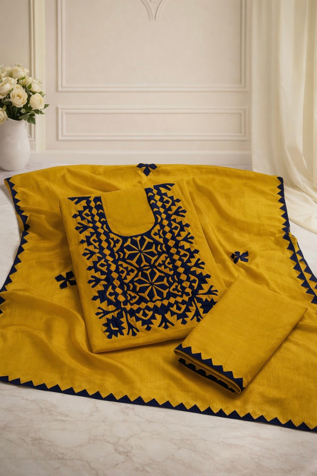 This beautifully crafted unstitched three-piece dress is a perfect blend of traditional artistry and elegant design. The shirt and trouser are made from soft cotton fabric, offering comfort along with a graceful fall. The dupatta is designed in lightweight chiffon, enhanced with delicate applique work that adds a luxurious touch.