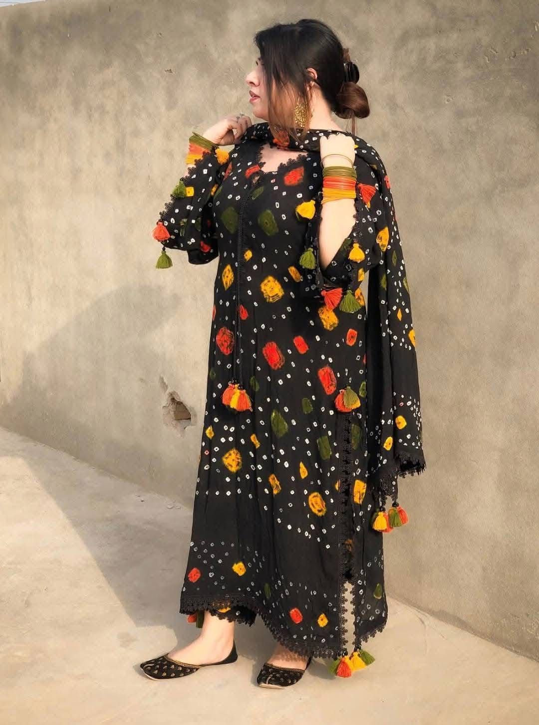 Embrace tradition and elegance with this beautiful Rajastani Arabic Linen Chunri Dress. Made from soft and breathable Linen fabric, this unstitched 3-piece dress comes in a rich black base with vibrant chunri prints. Perfect for cultural events, festive occasions, or casual gatherings, this outfit offers both comfort and timeless ethnic style.