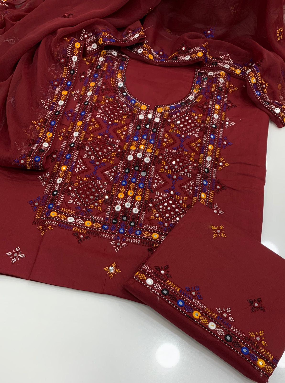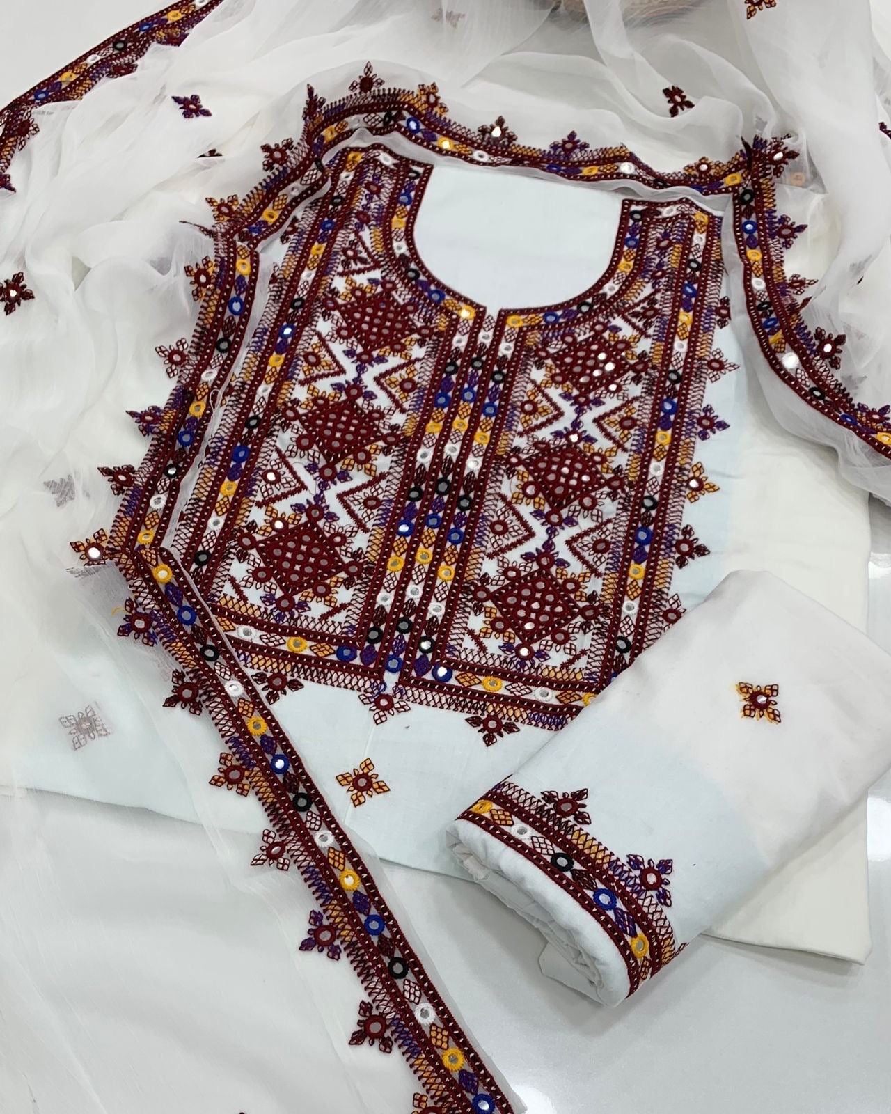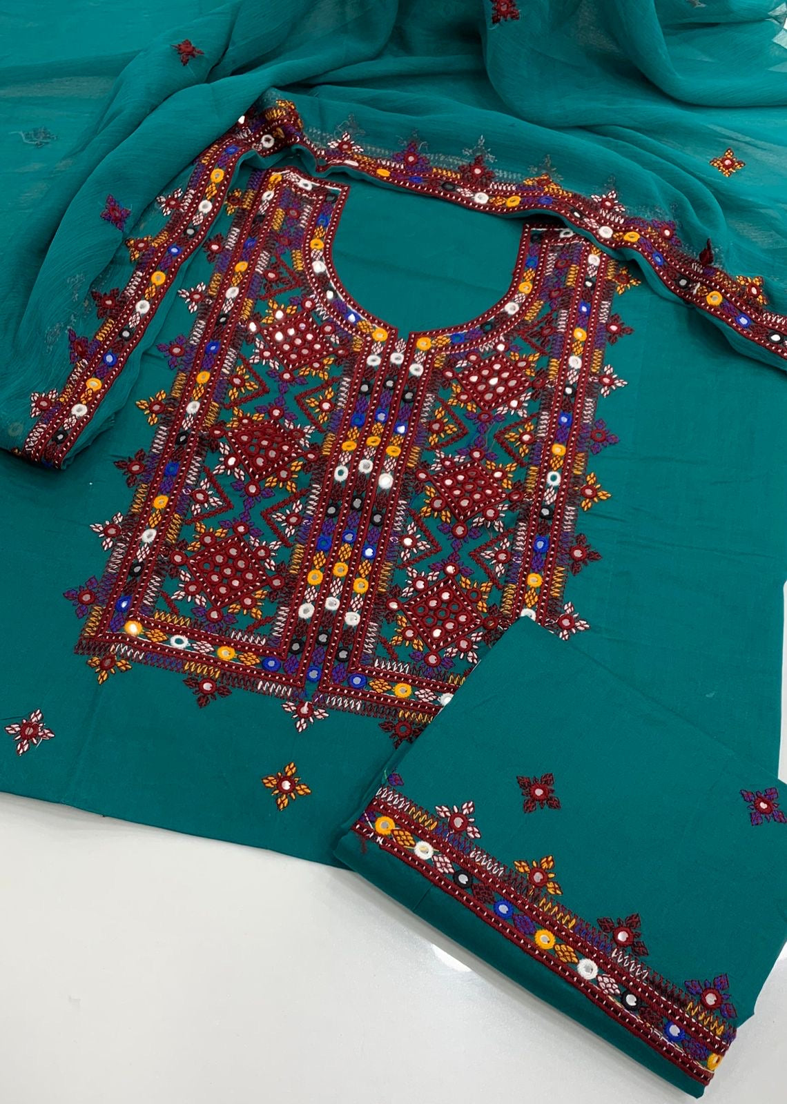 The shirt features traditional Balochi embroidery with thick thread and intricate sitara (mirror work), reflecting timeless craftsmanship. The dupatta comes with double-sided embroidered borders, adding a graceful finishing touch. This ensemble beautifully blends tradition with modern elegance — perfect for festive occasions or cultural gatherings.